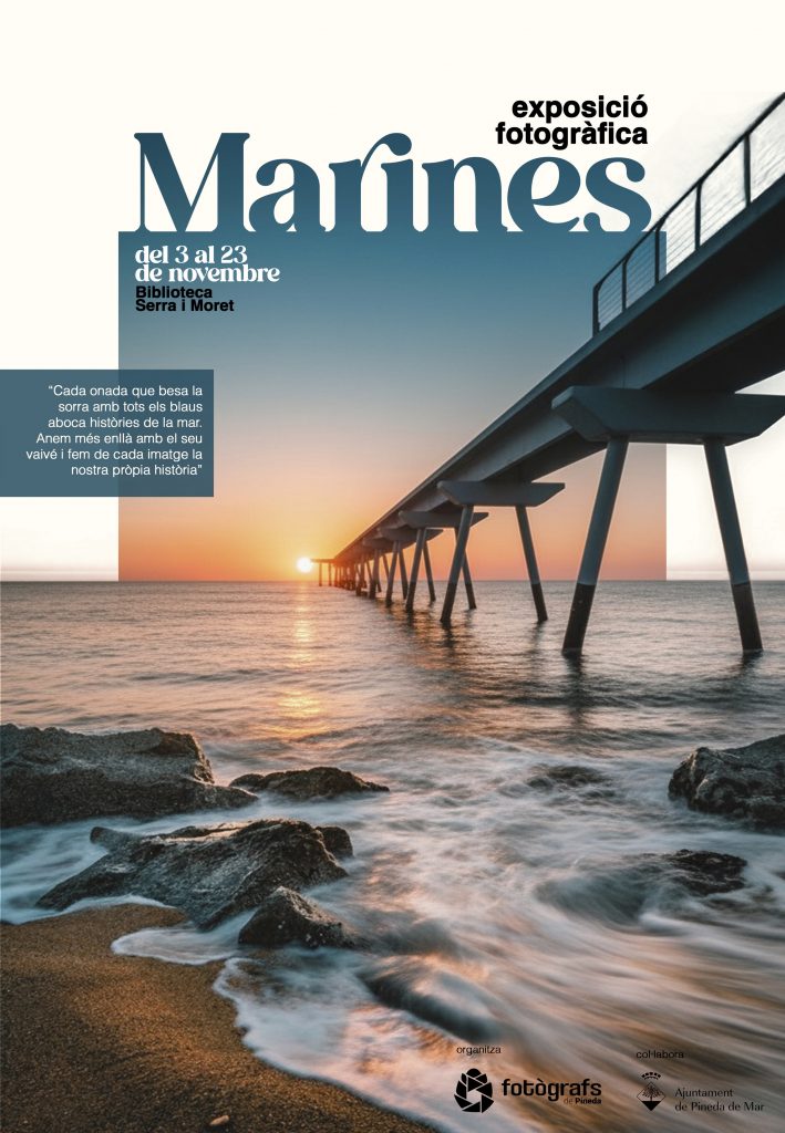 Ens complau fer-vos saber que aquesta exposició dels Fotògrafs de Pineda, dedicada al món del mar, es podrà visitar des de dilluns 3 de novembre fins divendres 21 de novembre a la biblioteca Serra i Moret, en el seu horari habitual. Trobareu 23 imatges que, de ben segur, us agradaran força.